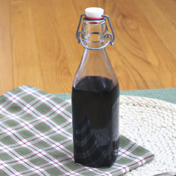 Then, I let the mixture cool. Once it’s cooled I finish up by adding 3/4 cup of honey. This will thicken the liquid somewhat but it is usually still a thinner consistency than the store bought varieties. The mixture can then be transferred to a bottle or jar and kept in the refrigerator. I like to use a bottle like these swing-top bottles but ordinary mason jars work good for storage too.
