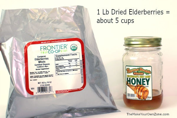 The two main ingredients in homemade elderberry syrup are dried elderberries and honey. Because this is a medicinal mixture, raw local honey is the preferred honey to use. I was able to find both these ingredients at reasonable prices at my local health food store ($23.50 for 1 lb of dried elderberries and $7.29 for 24 oz of raw local honey). I also did some measuring and found that a one pound bag of dried elderberries contains about 5 cups. The bag of dried elderberries can be kept in your refrigerator and they will keep for many months. You can also find elderberries on Amazon – – > One Pound Bag Dried Elderberries (affiliate link)