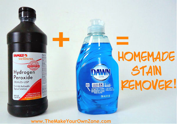 If you have a stubborn stain, it might be worth it to try this easy homemade stain remover that’s a simple mixture of 1 part Dawn dish soap and 2 parts hydrogen peroxide. I’ve got three stories to inspire you for how this handy DIY mixture has come to the rescue and worked great!