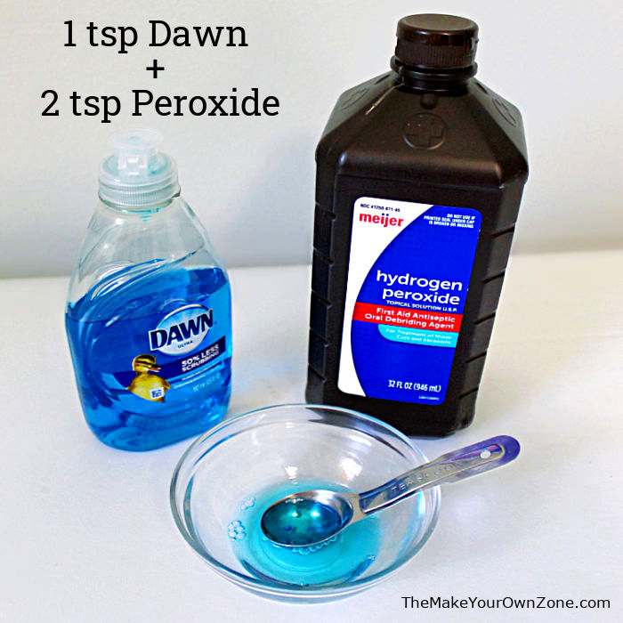 Most of the time when I make this I use 1 teaspoon of Dawn with 2 teaspoons of hydrogen peroxide that I mix together in a small bowl. But remember – you can make this in any size batch by just following the formula of using twice as much peroxide in the mixture as you do Dawn dish soap.
