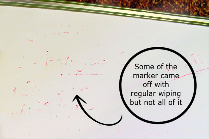 Here’s a closer photo of what these kinds of marks and stains on my whiteboard looked like. The majority of the marker wiped off, but I was left with annoying little areas that weren’t clean.