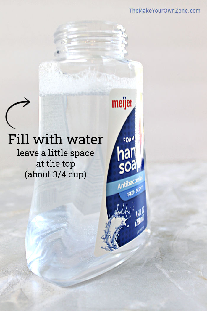 - Slowly fill the foaming soap container the rest of the way with water. Leave a little space at the top for inserting the pump top back onto the bottle.