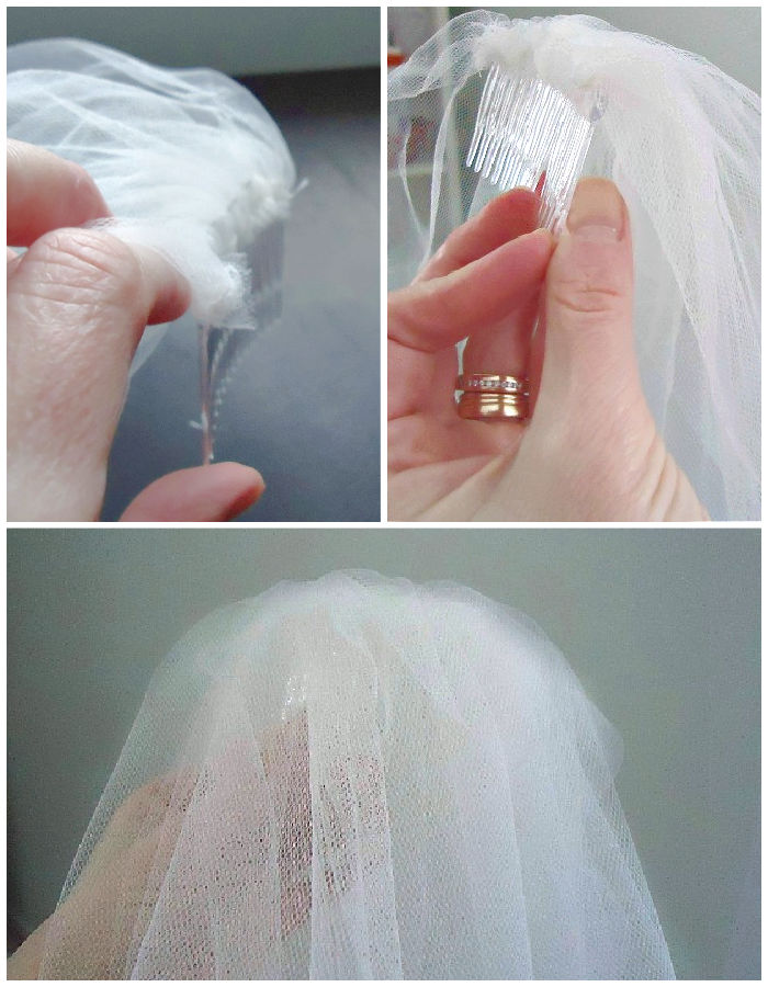 And now your homemade bridal veil is complete! To wear the veil, you will be pointing the comb downward with the veil coming over the top. This keeps the unfinished side of the veil against your head where it can’t be seen.